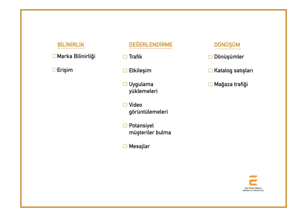 Business Manager’da toplamda 11 farklı kampanya türü bulunmaktadır. Temelde 3 farklı kategoride kampanya çıkılabilmektedir. Bunlar Bilinirlik, Değerlendirme ve Dönüşüm kampanyalarıdır.